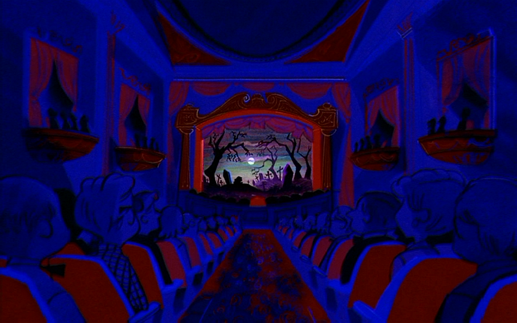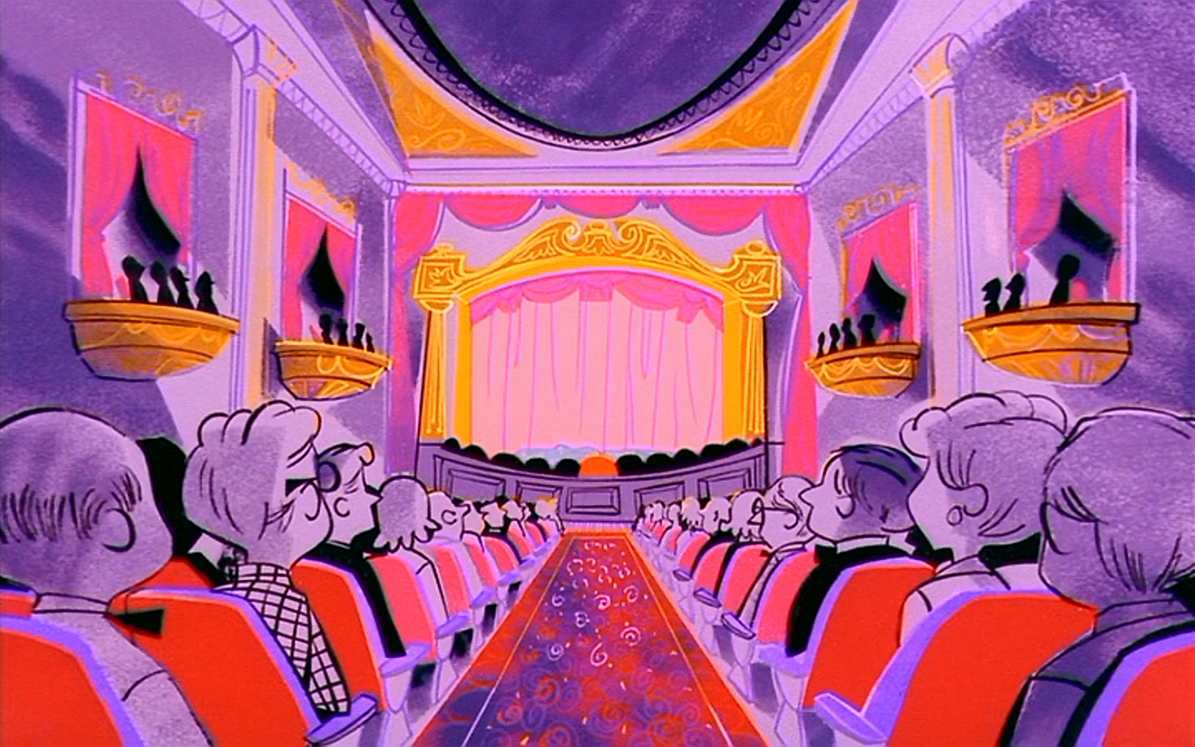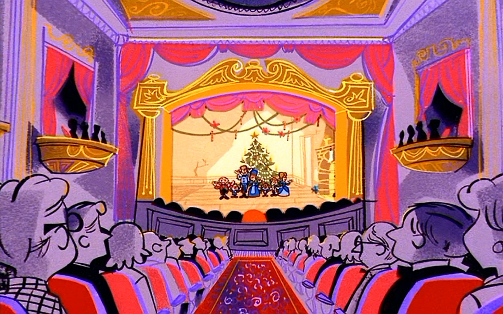 I really like how the theatre looks. Everything is purple and red. This frame story, of the theatre and Magoo getting there, is cut completely out if you catch this one on television. The audience is ready to see Quincy play the part of Scrooge.
