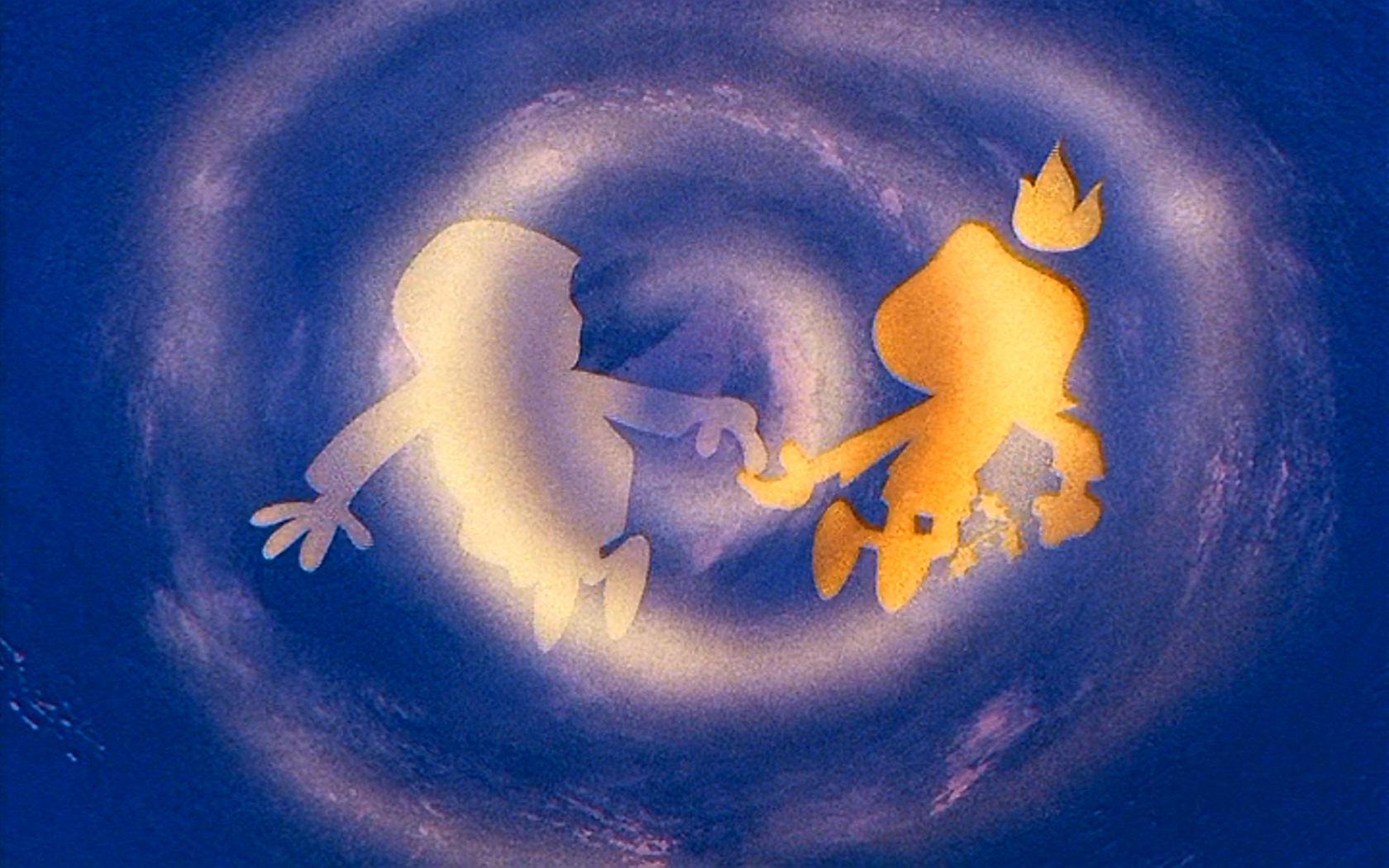 This is a good shot, Scrooge as a ghost with the Ghost of Christmas Past traveling through a psychedelic whirlpool into Scrooge’s past.