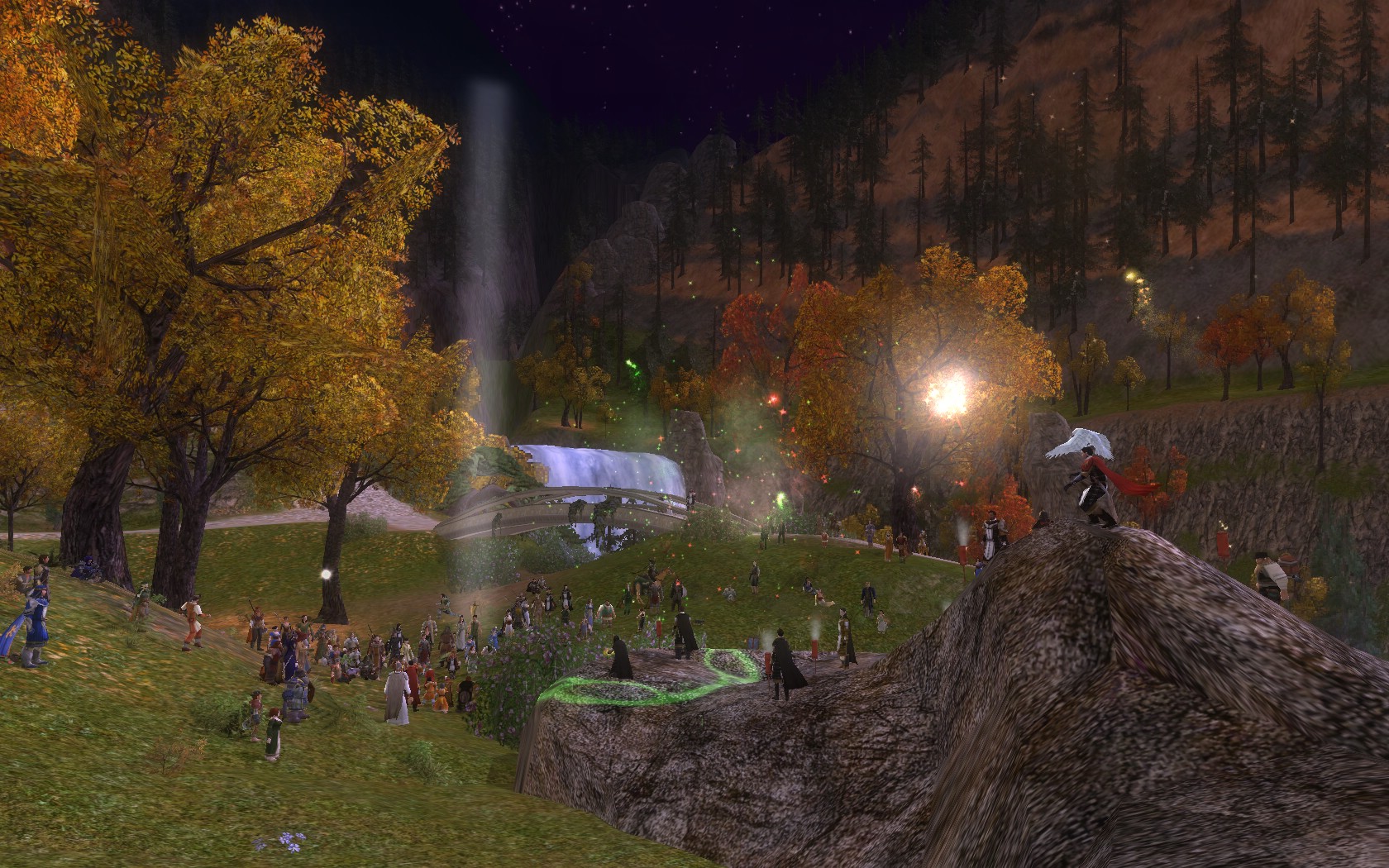 This shot is from farther away and is from a first-person perspective. It shows all the people there with the Falls of Imladris behind them. No idea where that glare comes from, it’s not like I took this with a camera or anything.