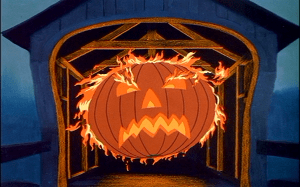 Icky is knocked outta the ballpark! You’ll recognize this shot (the flaming punkin), as Tim Burton paid homage to it in his version starring Jack Sparrow.