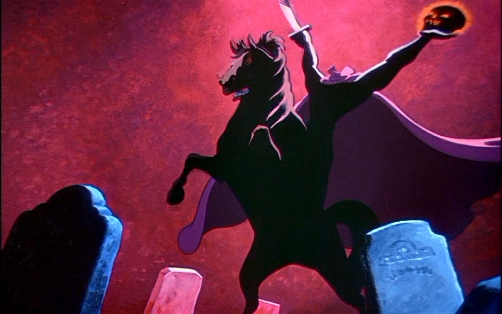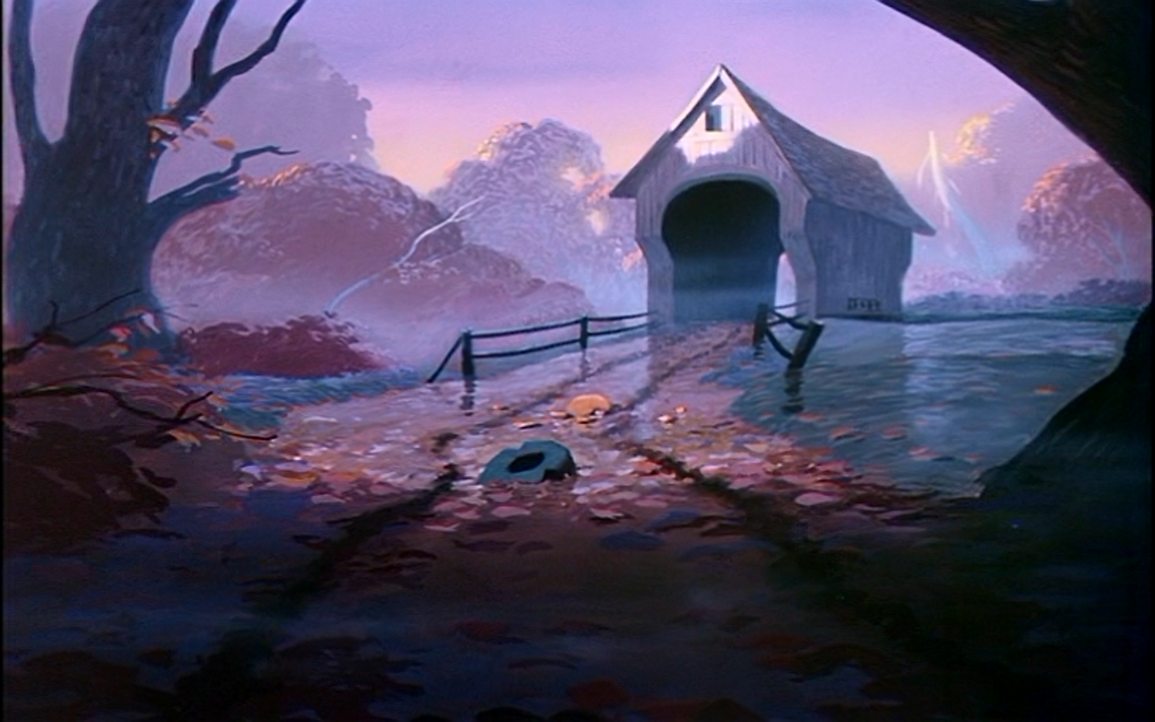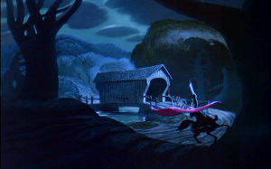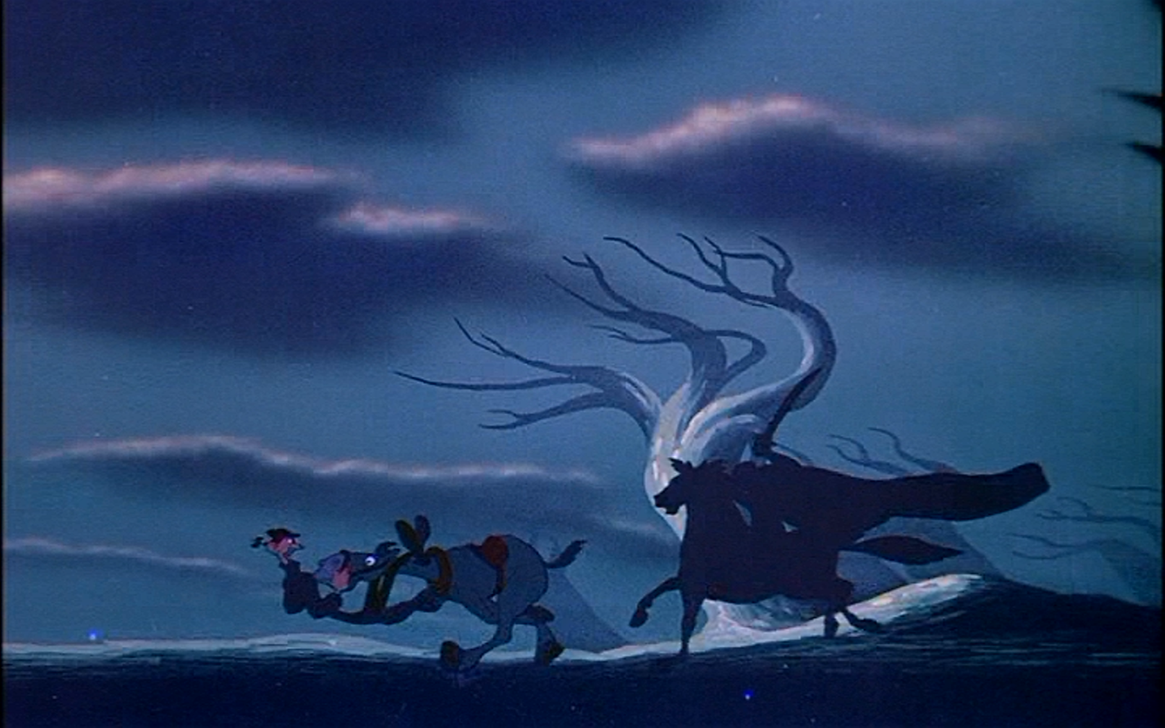 The suspense is gone, replaced by a pulse-pounding chase scene between the Horseman and Ichabod Crane. You can’t see it in this shot, but the Horseman is between Icky and the bridge.
