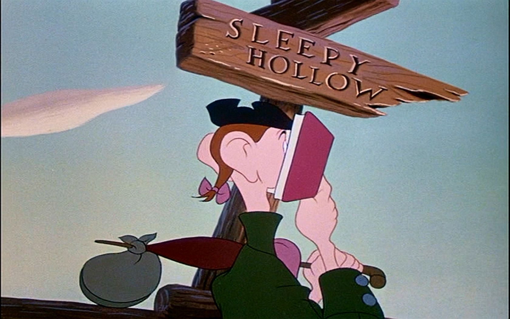 As the story of Ichabod begins, we see a gangly shadow, loping across a field, on his way to his new position as head schoolmaster. I like to think that, since we see his shadow first, that this is foreshadowing of Ichabod’s ghost, telling us that his tragic spirit still roams the hills and hollows of upstate New York. In fact, at the end of the film we are even told that his spirit still roams around the area.