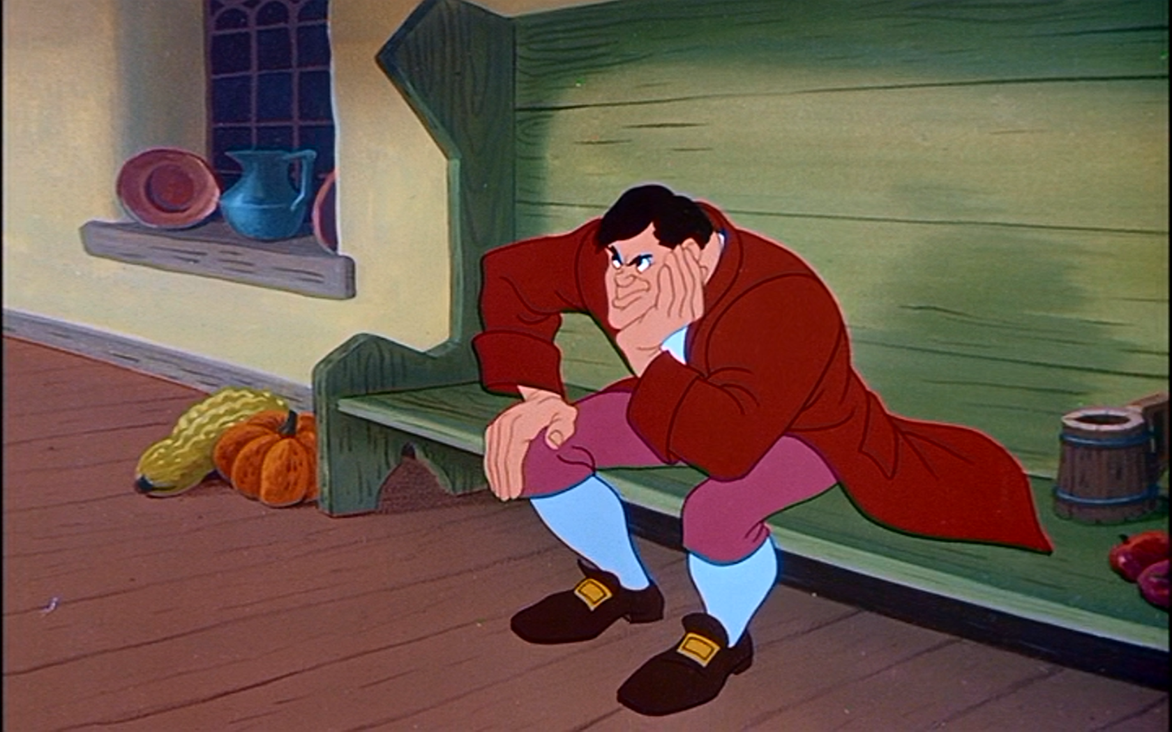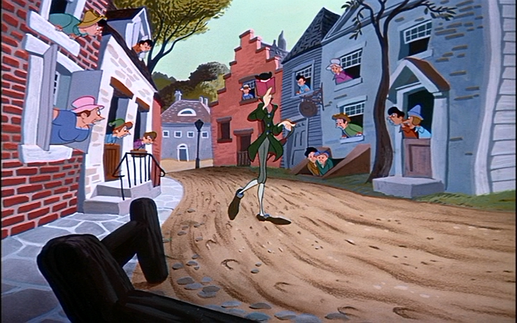 As Ichabod glides on into town on those shovel-like feet of his, we get the first appearance of Brom Bones. In 1949, Davy Crockett was hugely popular, and Brom wearing the trademark coonskin cap here straight away lets us know that he is adventurous, gregarious, and possibly even a little reckless… but all in a good-natured sort of way.