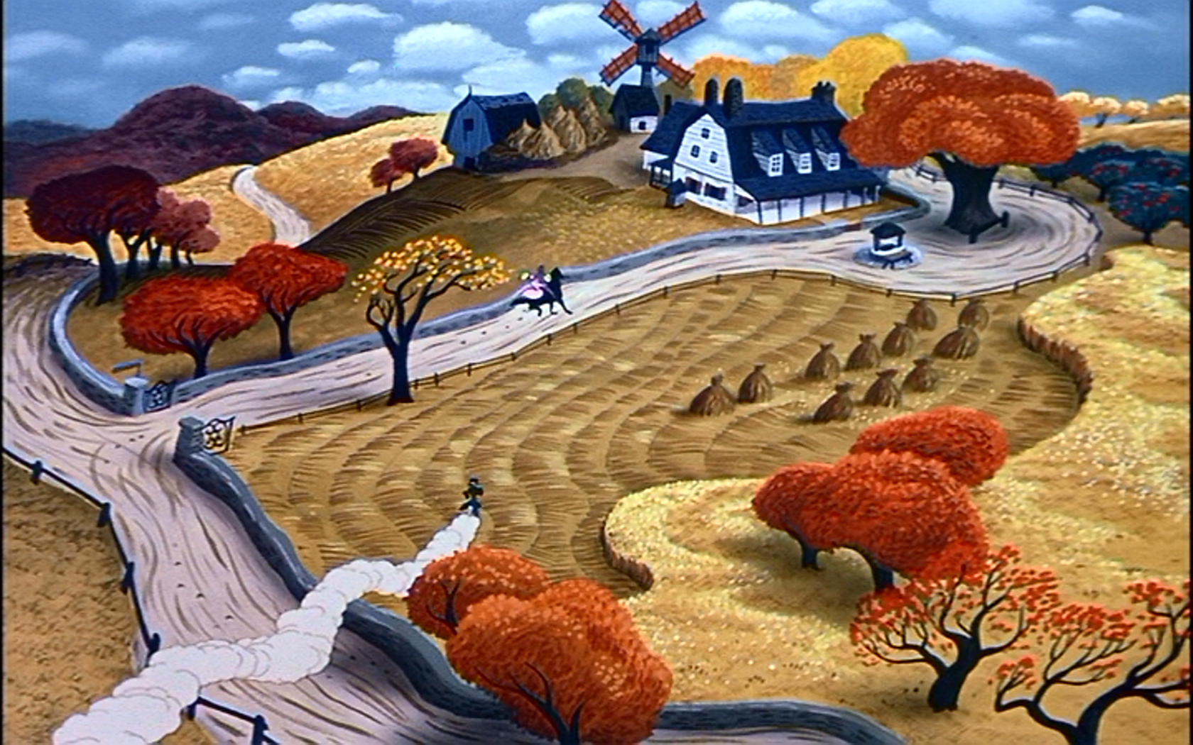 Ichabod pursues Brom back to the van Tassel estate. Click on this picture and make it big. I really love this shot. It’s shots like this that make me love this film so much. Paintings that, if taken out of the context of the film, would make a great work of art to hang on your wall. This has kind of a “folk art” quality to it, which goes along with the rural setting of the entire story.
