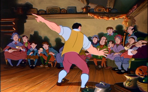 In this scene, Katrina is shopping, as usual. Women be shoppin! She has a group of her lapdogs helping her carry her purchases… until Brom rides up and shoos them all away. Bing tells us that Katrina often wishes that a champion would “take the field openly” and oppose Brom Bones in winning her hand. Of course, Ichabod, being both confident and naive, is ready and willing to accept this challenge.
