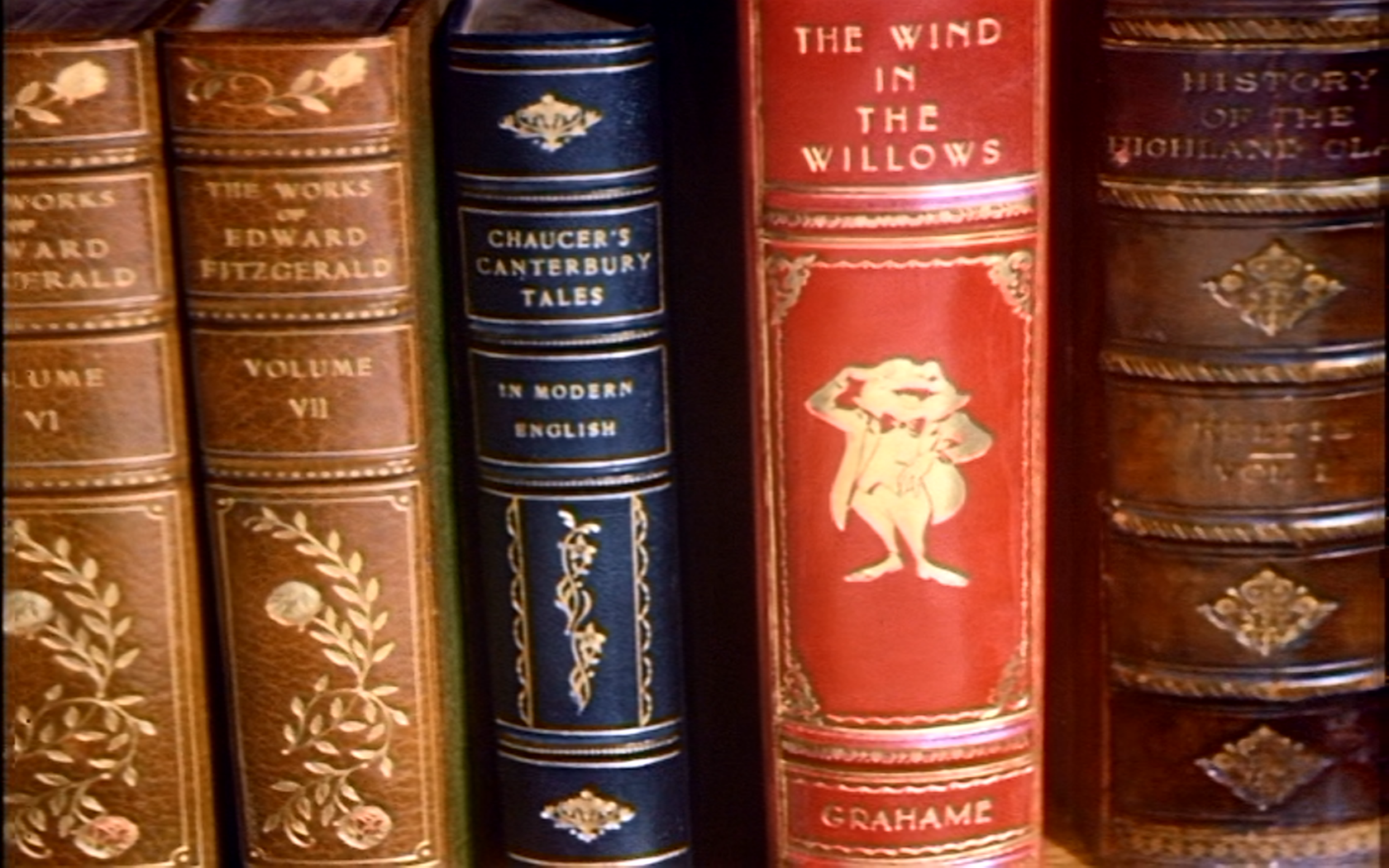 The camera zooms across a nice, stately, proper library, presumably in someone’s home. Basil Rathbone, a Brit himself, is telling us about classic characters in English literature. He is helping us pick out a book, and finally decides on the Wind in the Willows.