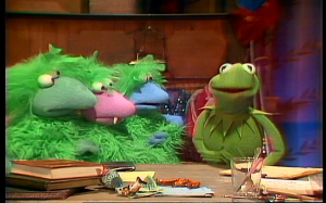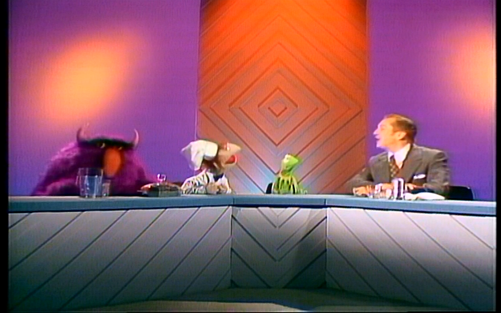 After the Statler and Waldorf incident, Kermit hosts a talk show. The topic today is “Gourmet Food”. From left to right we have: Random Purple Monster (described as a professional eater. Look out, Joey Chestnut!), a stereotypically pompous French chef, Kermit, and Vincent Price (described as a professional food critic. look out, Dom Deluise!)