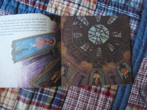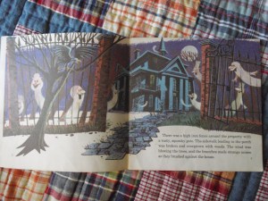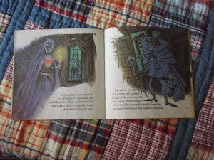 You may notice that the look of this Haunted Mansion is more like from the cover of the original “Chilling Thrilling Sounds” record than like the actual Haunted Mansion ride. This record was released in 1970 (41 years ago! lawd.), after the ride had been opened in 1969 in Disneyland, so I have no clue as to why they didn’t make the Mansion in this book resemble either of the Haunted Mansions that were in operation in the parks. But, therein could be the reason: perhaps they didn’t want to alienate anyone by making either the East Coast Mansion or the West Coast Mansion appear as though it were the “official” Haunted Mansion of Disney. It also could have been that they just wanted to keep the Mansion looking the same to preserve the records’ continuity and theme.