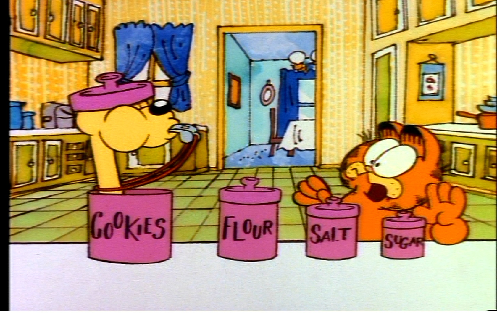 This is the 2nd scene where Odie busts Garfield trying to sneak a snack. This gag is kind of a Scooby-Doo style “which-jar-is-Odie-in” deal. Of course, he is in all of them, though I don’t know why Garfield would want a snack of flour or salt, unless he’s really just that desperate for something other than lettuce.