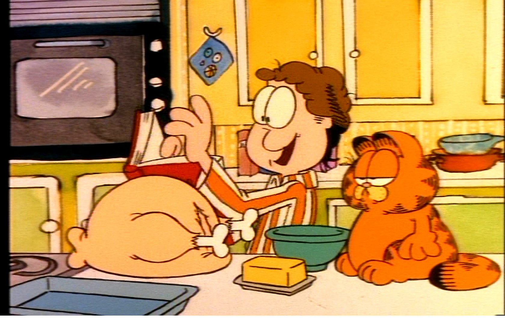 If I had waited, I would have seen that the cookbook tells Jon this exact thing, which he shrugs off as “a minor technicality.” Garfield says, “Yum yum, turkey on a stick.” Garfield, you are just too much.