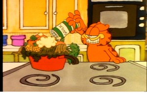 Jon throws a bunch of veggies in a pot, pours a little water on them, then leaves to get ready for Liz. Garfield says, “What good is Thanksgiving if you’re on a diet???” I heard that, brother.