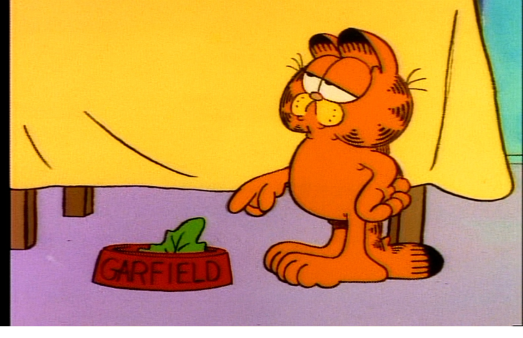 Upon arrival home, Jon has dinner, and gives Garfield the dinner that has been prescribed for him for his diet. A lettuce leaf in a bowl. Again, I completely empathize with this. Here it is, the very kick-off point of the Holidays, and Garfield can only eat twigs and berries. I have cheated lately, I’m not gonna lie, so we can only expect the same from a cartoon cat whose main purpose in life is to eat as much as felinely possible.