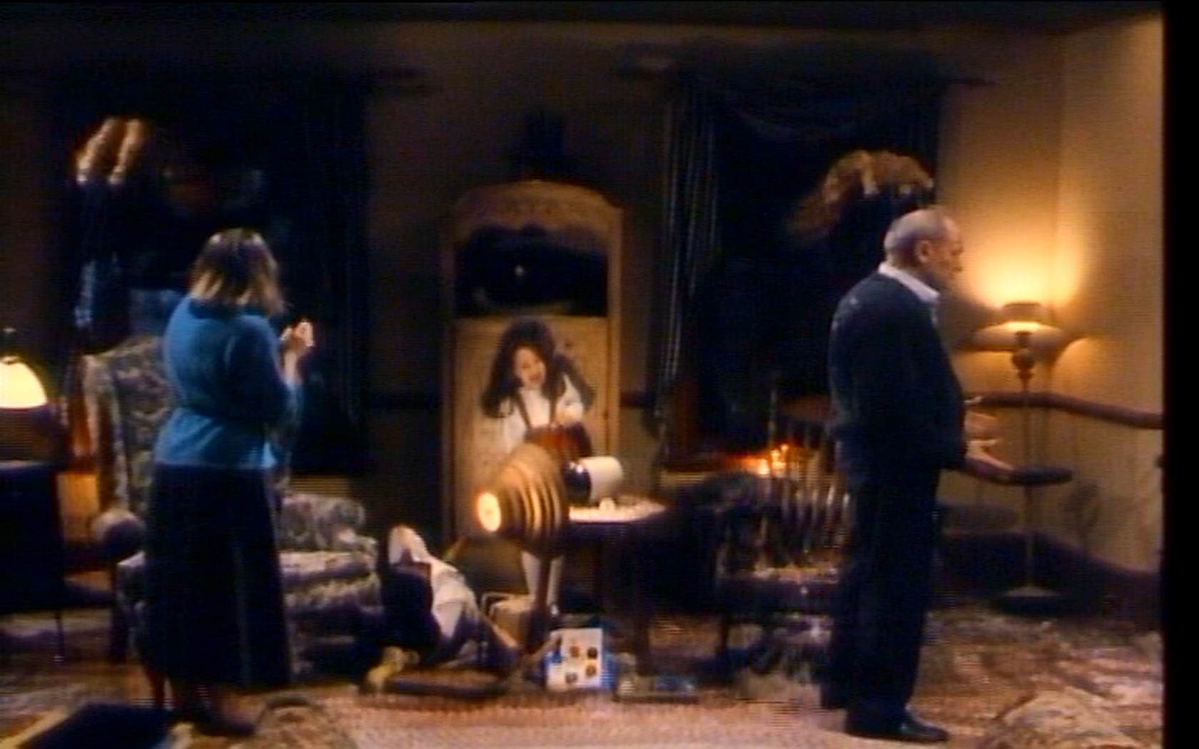 Although Santa has sent a warning with the busted-ass train (the mom tells the daughter that), it doesn’t take long for our family to settle down into their comfortable, Christmas Eve, roles. The only thing that could make this shot better is if EG Marshall was smoking a pipe. Instead, I think he’s having a little nip of moonshine.