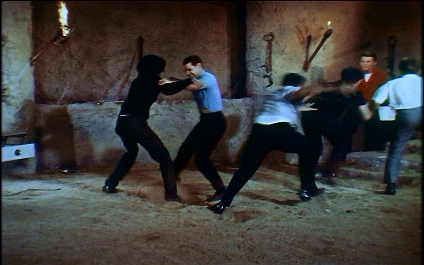 One of the gorillas and a guy who looks just like the Creeper from Scooby-Doo (green face, black clothes, and a wig) have captured another girl. It won’t be long before they have all the gals chained up in Mad Doctor’s basement of terrors.