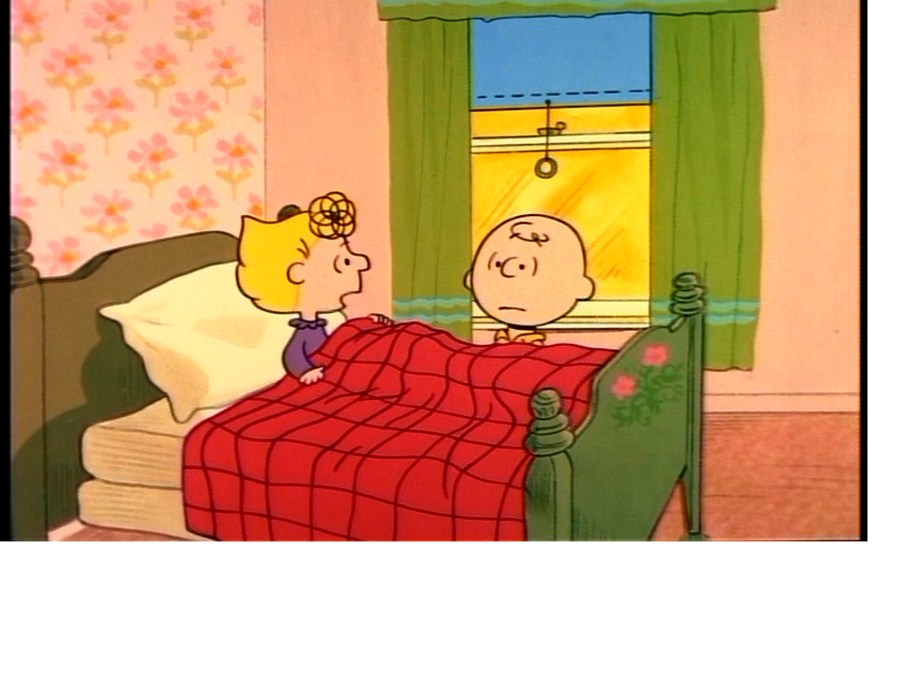 Charlie tries to wake Sally up so she’ll go to school. “I’m not going to school again.”